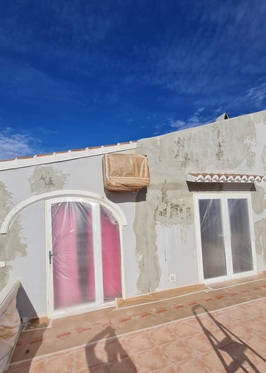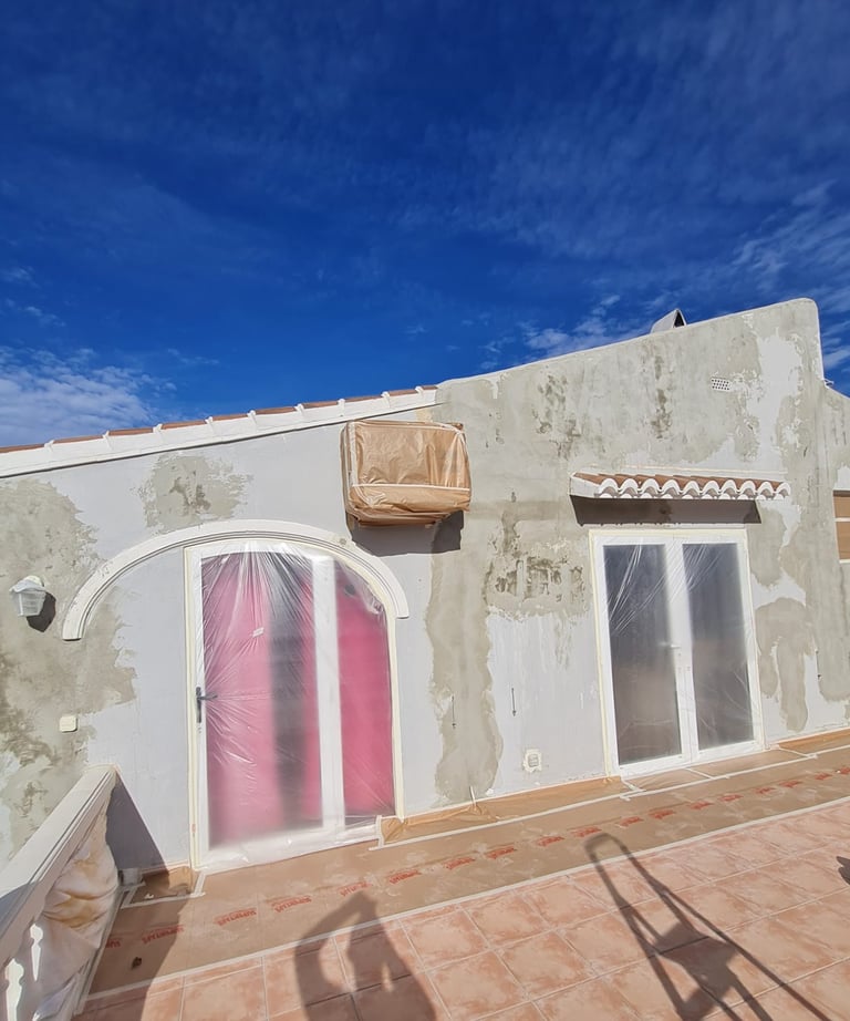 Wall coatings are much thicker than standard paint, so spraying ensures an even, protective coverage. The team carefully masks off all areas and protects plants, ensuring no mess.